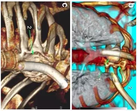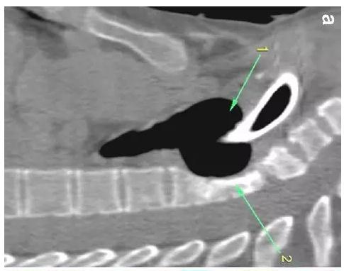 下圖箭頭1為氣切套管氣囊緊貼T1-4椎體水平,造成椎體前部受到侵蝕(箭頭2):